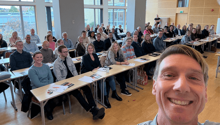 Så här såg det ut när 80 ekonomer i Småland fyllde salen för en inspirerande föreläsning med Tobias Ljung om Excel & AI. Perfekt inslag på kick-off, personaldag eller avslutning – och funkar bra som webinar också.